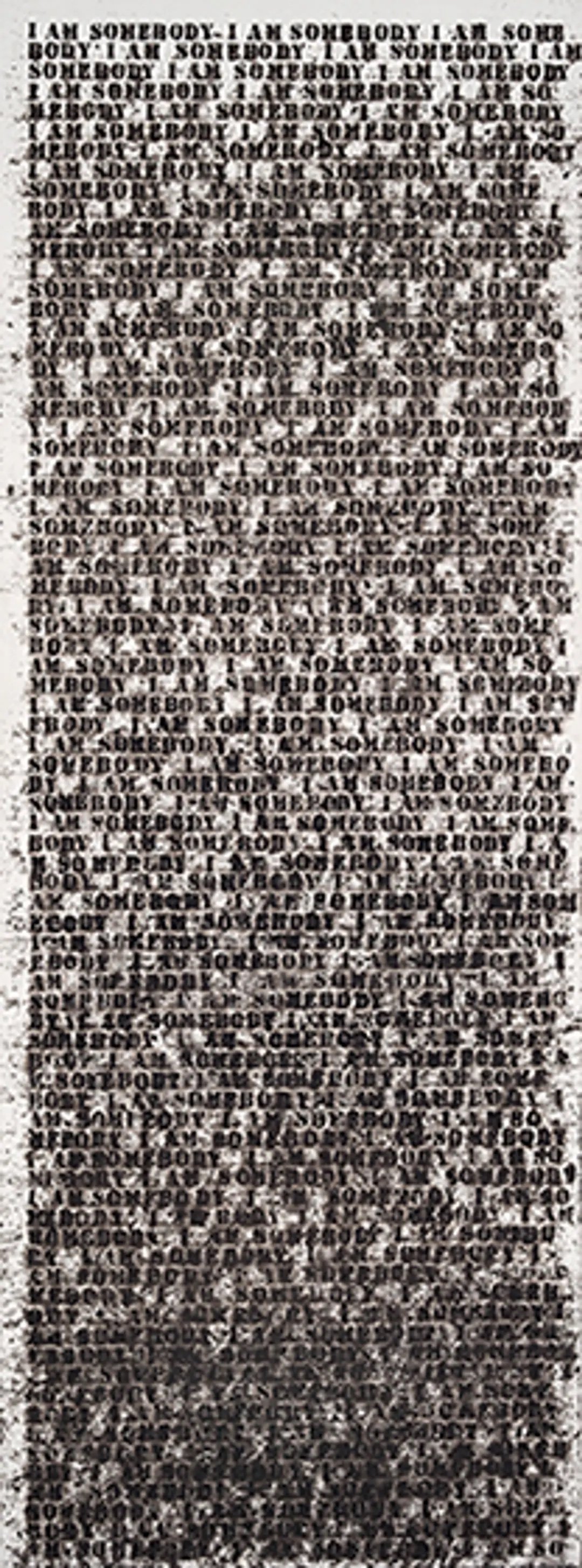 Ligon’s work takes its title from a poem first penned in the 1950s by Atlanta pastor Dr. William Holmes Borders. The artwork repeats the phrase "I Am Somebody" while progressively increasing the abstraction and dissolution of the painting’s text. Reverend Jesse Jackson reimagined the poem in his inspirational recitations in the early 1970s. His free verse rendition with children on PBS’s Sesame Street in 1972 continues to be a monolithic display of self-affirmation.
